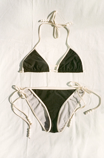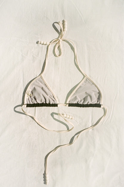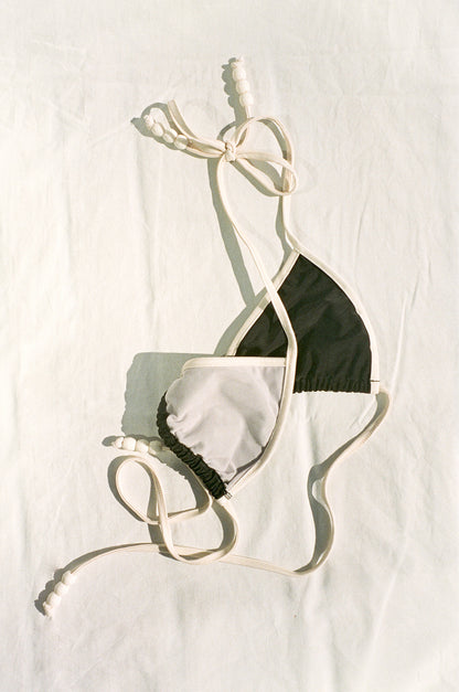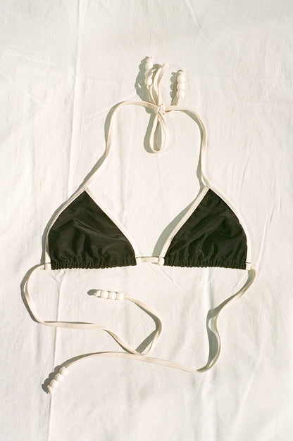 The Biarritz Top is a triangle bikini top with three beads at all ends for that summer feel. It has adjustable straps and is fully lined so it isn’t transparent when wet.