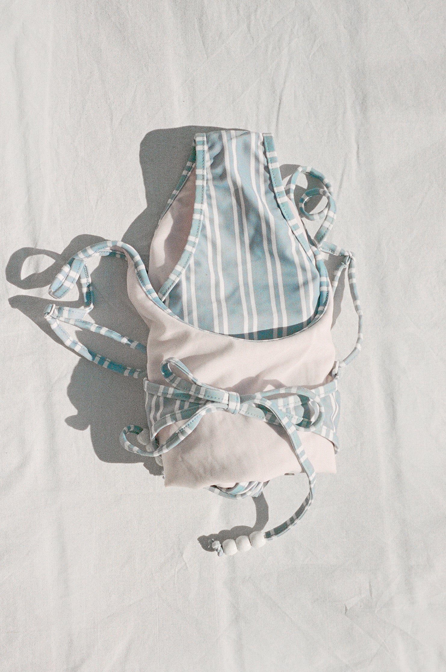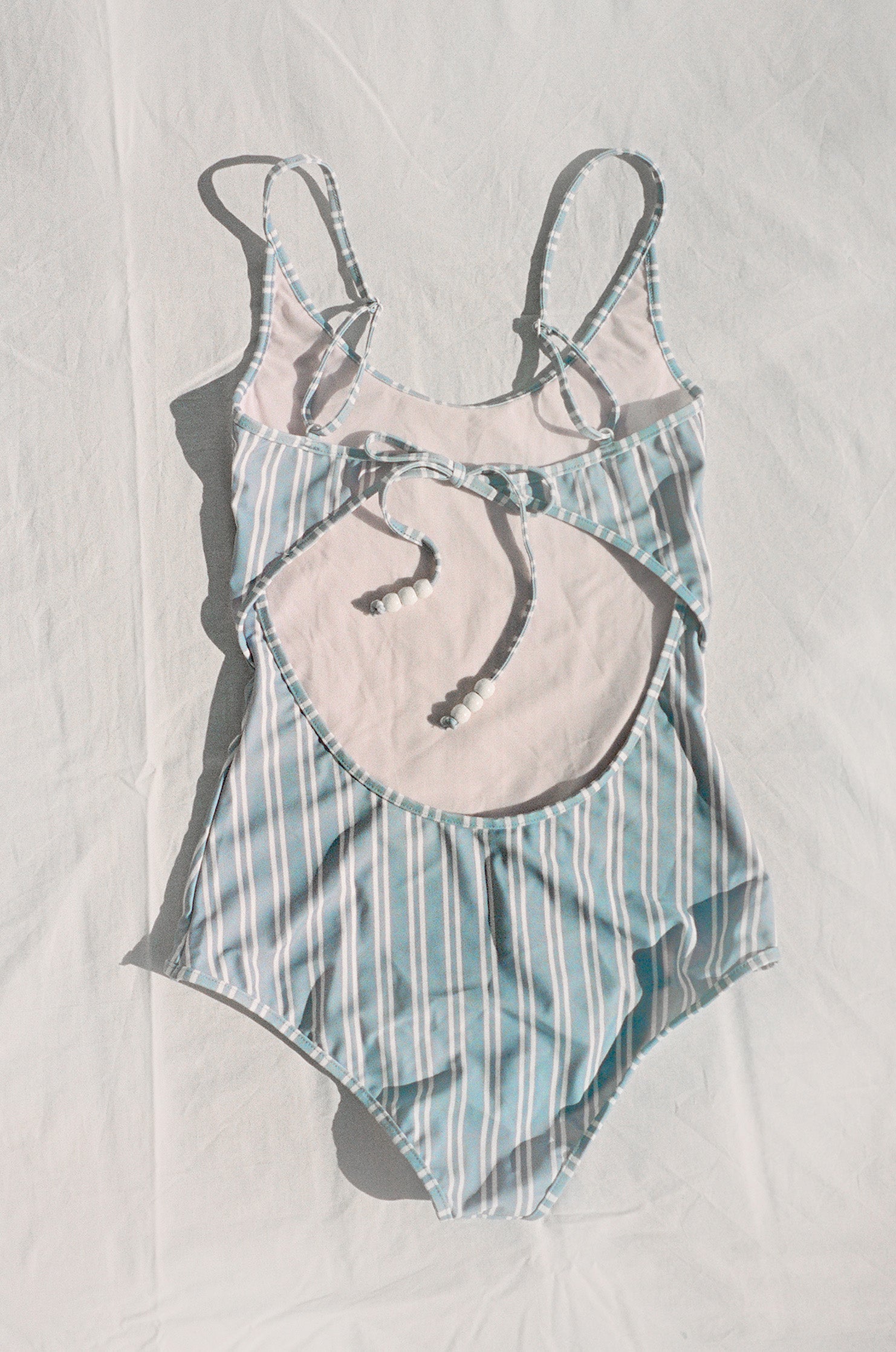 The Saona Swimsuit is a beautifully cut swimsuit with a classic front and an elegant back. The swimsuit has adjustable straps that ties at the back so you adjust the fit around you body and boobs. It makes it great for a swim in the sea but also comportable going out at night. It is fully lined with the three white beads at the end of the straps.