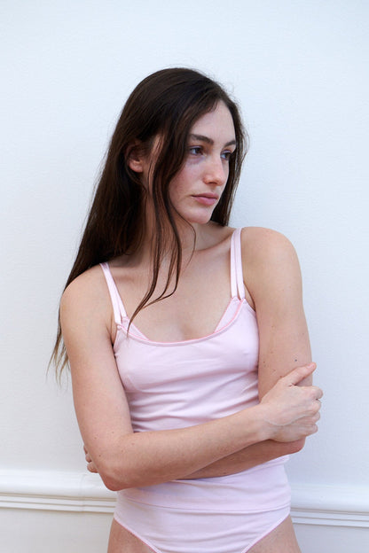 Underwear top in basic cotton is covering the need for an underlayer. For some the tight construction can replace a bra. Featuring a subtle-flat silhouette & the scoop neck.